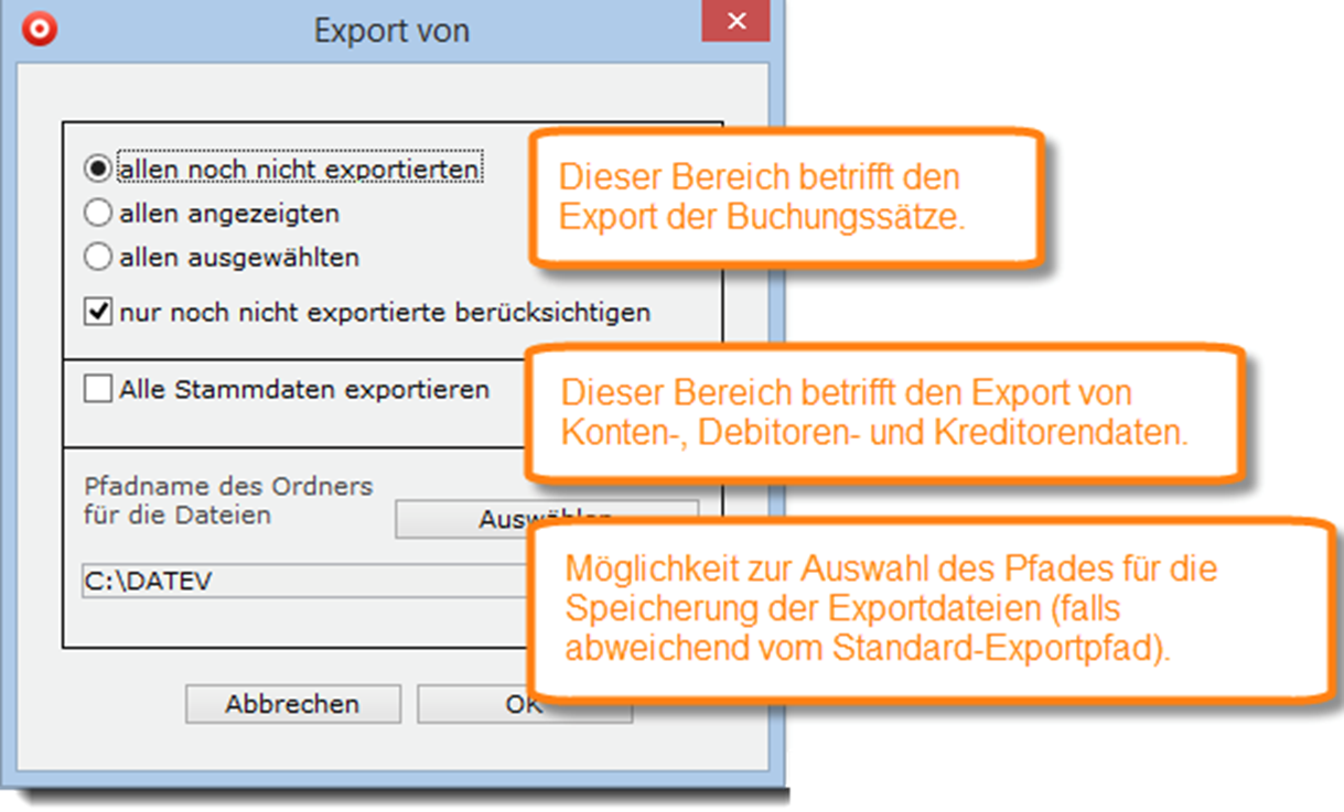 Starten Sie das Modul „Buchungssätze“, so gelangen Sie in die Bildschirmliste des Moduls. Führen Sie aus dem Menü „Spezial“ der Bedienleiste die Funktion „DATEV“ aus, so öffnet sich ein Dialog, in welchem Sie festlegen können, welche Buchhaltungsdaten exportiert werden sollen.