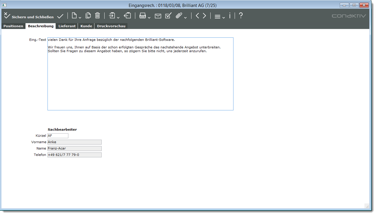 Klicken Sie auf das Register „Beschreibung“, so gelangen Sie zu dem Teil der Eingabemaske, auf dem Sie eine Eingangsrechnung in weiteren Einzelheiten beschreiben können.