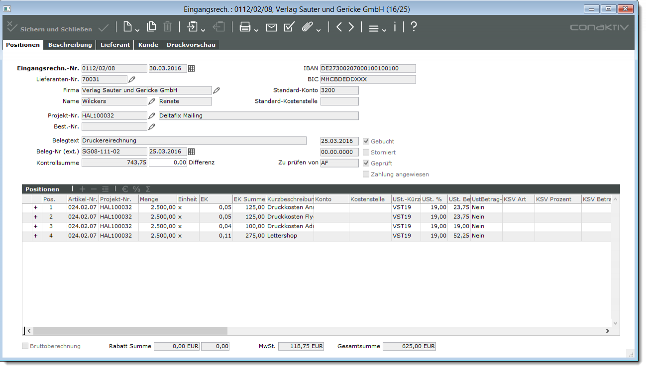 Öffnen Sie einen Datensatz des Moduls „Eingangsrechnungen“, so gelangen Sie auf das Register „Positionen“. Unter diesem Register erfassen Sie die Kopfdaten sowie die Positionen (siehe Abschnitt Eingabemaske, Register „Positionen“ ) einer Eingangsrechnung.