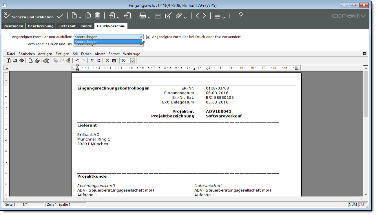 Nach Auswahl werden entsprechend des gewählten Formulars die Informationen, die Sie zuvor auf der Eingabemaske unter den Registern „Positionen“, „Beschreibung“, „Lieferant“ und „Kunde“ eingegeben haben, eingesetzt. Sie können nun, nach der Umsetzung, frei in diesem Text arbeiten und so Informationen eingeben, die Ihnen unter den Registern „Positionen“, „Beschreibung“, „Lieferant“ und „Kunde“ nicht zur Verfügung stehen. Sie können einen beliebigen Text eingeben oder eine Grafik einfügen.
