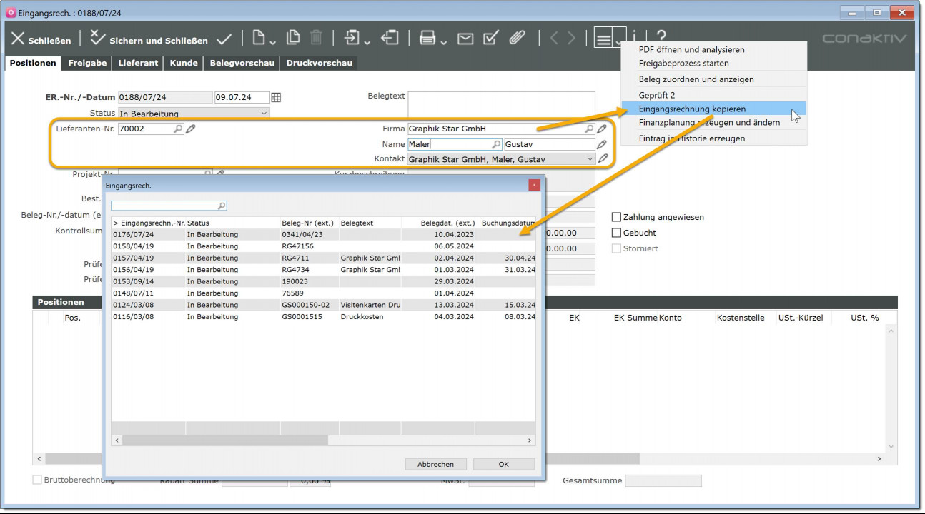 Alle relevanten Kopf- und Positionsdaten werden aus der gewählten in die neu angelegte Eingangsrechnung übernommen.