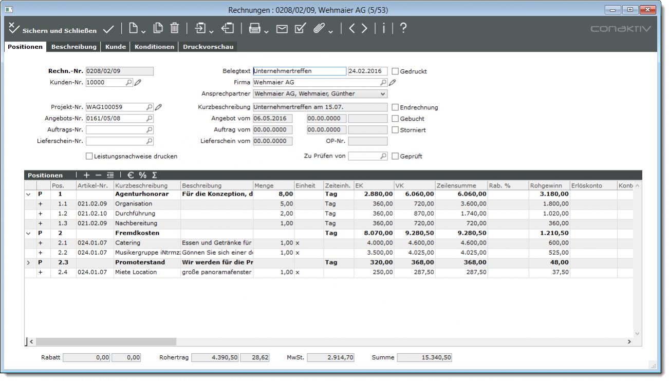 Es gibt eine Reihe von Möglichkeiten, in die Eingabemaske des Moduls „Rechnungen“ zu gelangen (beispielsweise durch Doppelklick auf einen Datensatz in der Bildschirmliste). Im Kapitel „ Grundlegende Bedienungshinweise “ finden Sie eine Beschreibung dieser Möglichkeiten. Lesen Sie sich bitte den entsprechenden Abschnitt in dem Kapitel zur weiteren Information durch.