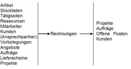In das Modul „Rechnungen“ können Daten aus einer Vielzahl von Modulen einfließen. Die Daten einer Rechnung selbst fließen wiederum in Ihre Buchhaltung und Auftragsabwicklung ein und können darüber hinaus in Verbindung mit den Modulen „Projekte“ und „Kunden“ zu Auswertungszwecken genutzt werden.
