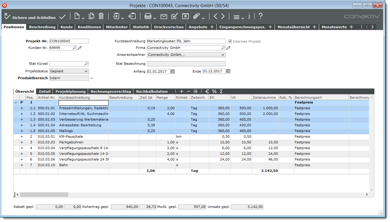Möchten Sie innerhalb der Positionsliste mehrere aufeinander folgende Einzelpositionen zu einem Leistungspaket zusammenzufassen, dann markieren Sie die gewünschten Positionen in der Positionsliste und klicken mit der rechten Maustaste (FFA) auf die Markierung und wählen Sie die Funktion „Zusammenfassen“ aus.