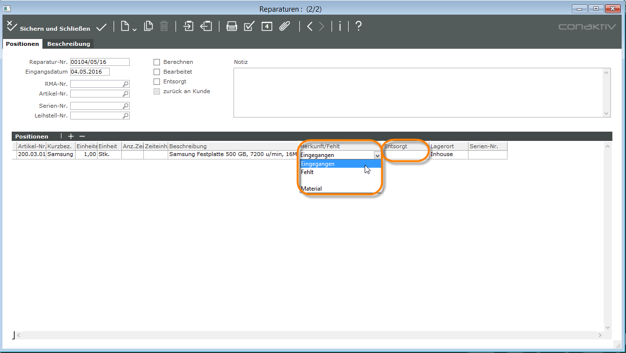 Wird ein Artikel oder eine Ressource über das Modul „Ressourcen“ in ein Lager eingebucht, wird ebenfalls ein Lagerbewegungsdatensatz erzeugt. Hierzu muss im Reparaturdatensatz in der Artikelposition in der Spalte „Herkunft/Fehlt“ die Option „Eingegangen“ ausgewählt sein und die Option „Entsorgt“ darf nicht auf „Ja“ stehen.