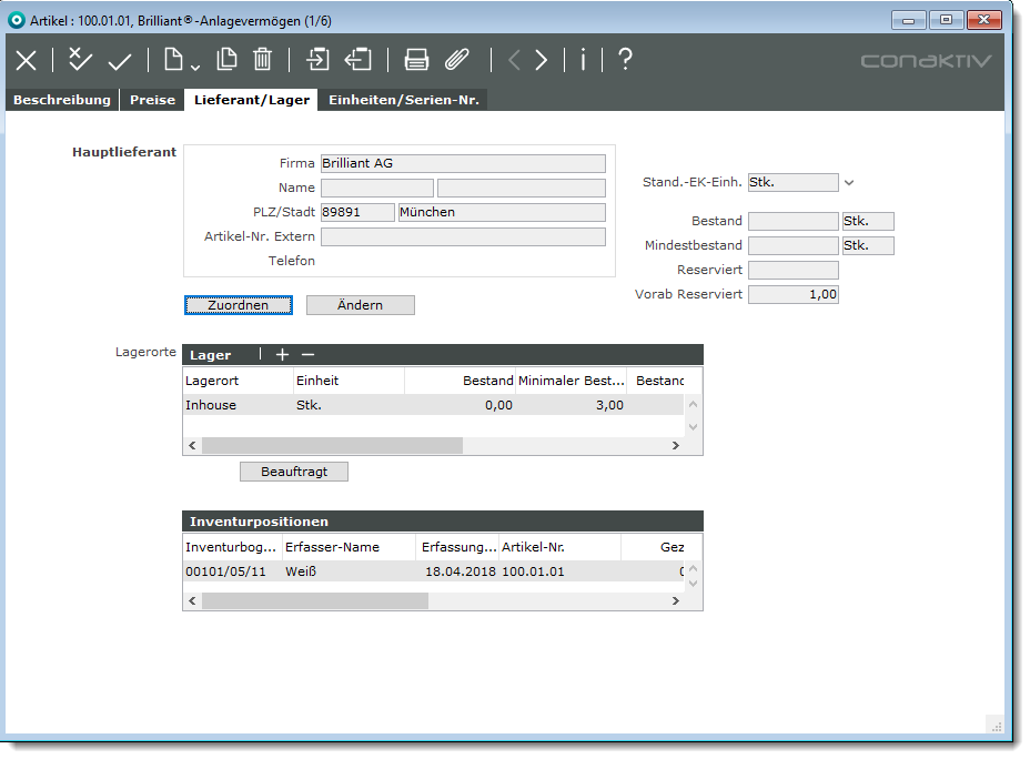 Klicken Sie auf das Register „Lieferant/Lager“, so gelangen Sie zu dem Teil der Eingabemaske, auf dem Sie u. a. den Lieferanten eines Artikels zuordnen, die Lagerorte, an denen Sie den Artikel lagern, definieren sowie die Inventurbestände des Artikels ersehen können.