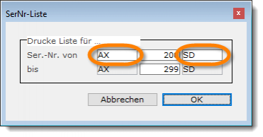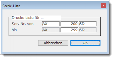 In diesem Dialog werden Ihnen zunächst die Vorbelegungen der Alphateile der Seriennummer, sofern diese vorbelegt wurden, angezeigt. Möchten Sie andere Alphateile als die vorbelegten angeben, so können Sie dies in den entsprechenden Feldern für die Angaben „Ser.-Nr. von“ erledigen.