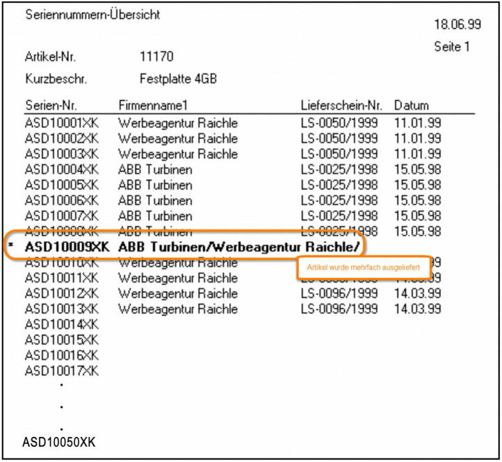 Die Liste zeigt alle Seriennummern aus dem ausgewählten Bereich. Wurde ein Artikel mit einer der angezeigten Seriennummern an einen Kunden ausgeliefert, so wird hinter die Seriennummer der Firmenname, die Lieferscheinnummer und das Lieferdatum gedruckt. Unter Umständen kann ein Artikel mit einer der angezeigten Seriennummern ausgeliefert, durch eine Gutschrift wieder ins Lager eingebucht und danach wieder ausgeliefert worden sein. Ist dies der Fall, so wird der entsprechende Listeneintrag mit einem Stern markiert, fett hervorgehoben und die Firmennamen aller Kunden, die den Artikel erhalten haben, angezeigt.