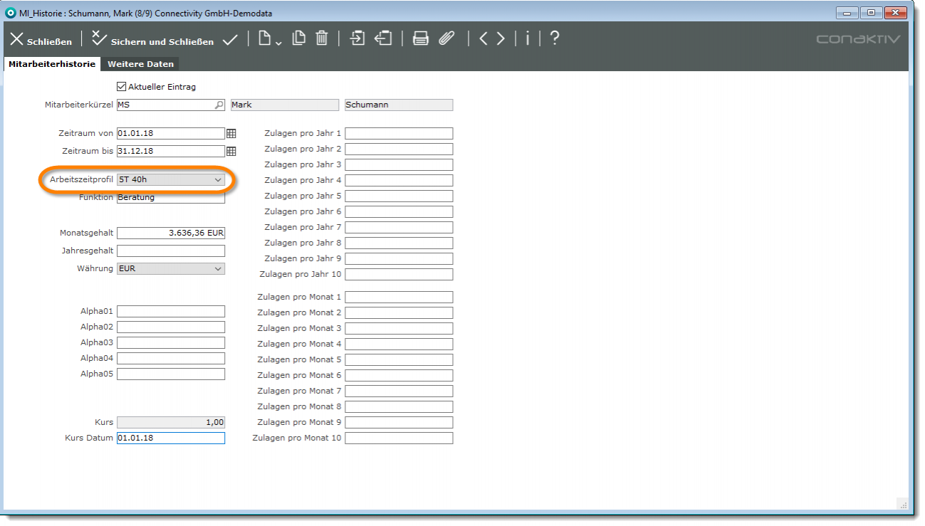 Die Zuordnung des Arbeitszeitprofils kann auch in einem Eintrag der Mitarbeiterhistorie eines Mitarbeiters für einen bestimmten Zeitraum erfolgen.