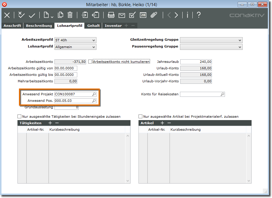Damit das Anwesenheitsprojekt automatisch mit den Restzeiten der Anwesenheit bebucht wird, müssen Sie dieses mit der dazugehörigen Anwesenheitsposition den Mitarbeitern zuordnen.