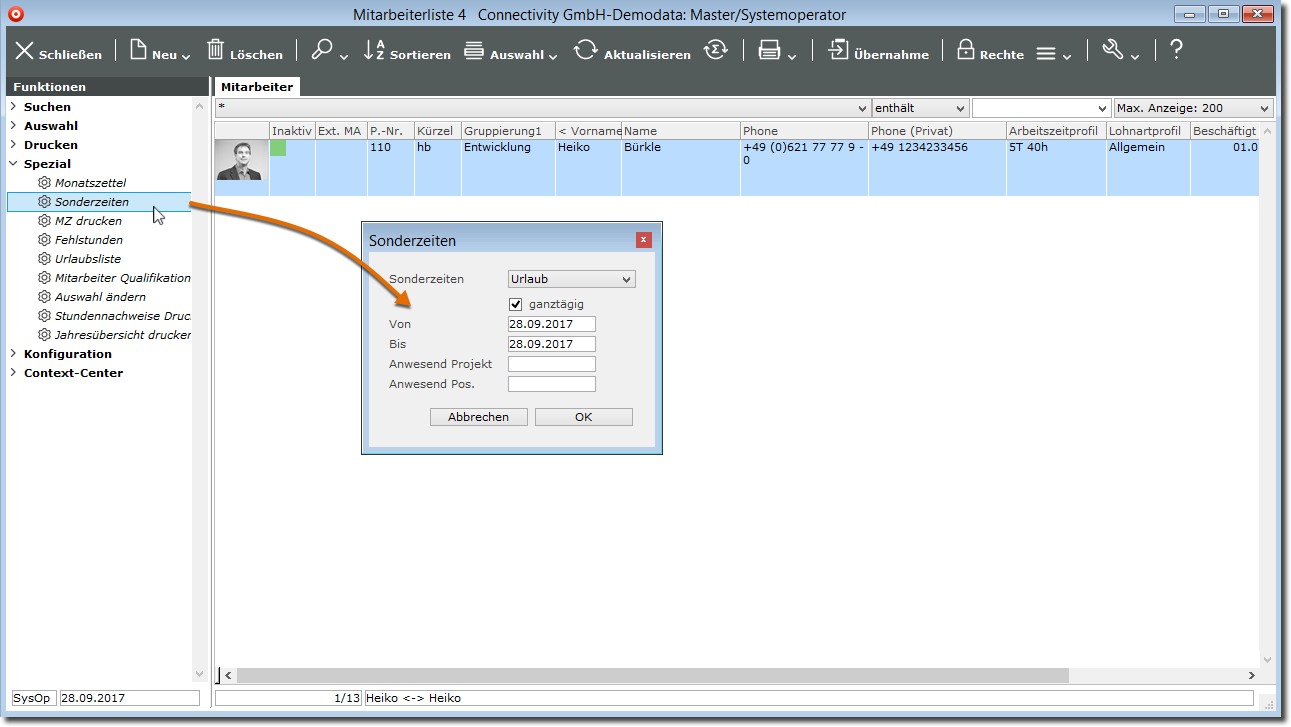 Sonderzeiten sind Zeiten, die nicht als Arbeitszeiten gewertet werden, z.B. Urlaub, Krankheit, Sonderurlaub und unbezahlte Freizeit. Mithilfe der Sonderzeiten können Sie festhalten, wie viele Tage ein Benutzer z.B. Urlaub in Anspruch genommen hat und ihm noch zur Verfügung steht oder wie oft der Mitarbeiter krank war.