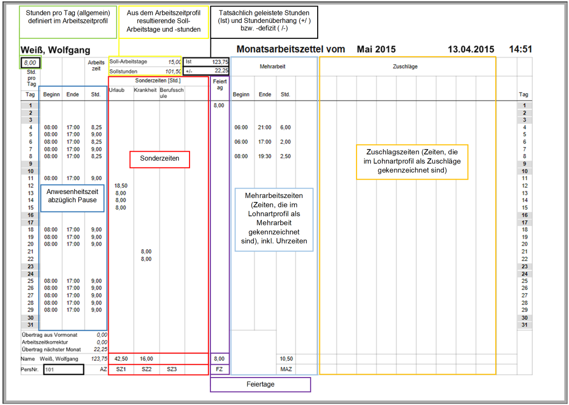 Auf dem Ausdruck wird der Monatszettel übersichtlich auf einer DIN A4 Seite (quer) dargestellt. Hier werden detailliert die angefallenen Zeiten dokumentiert, d. h. für jeden Tag werden separat die Zeiten mit den entsprechenden Uhrzeiten und die Verteilung (normale Arbeitszeit, Sonderzeiten, Mehrarbeitszeit usw.) aufgeführt.