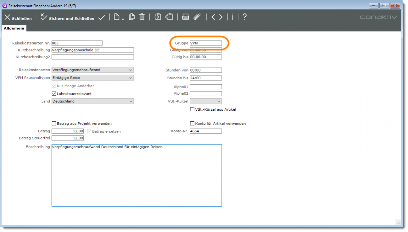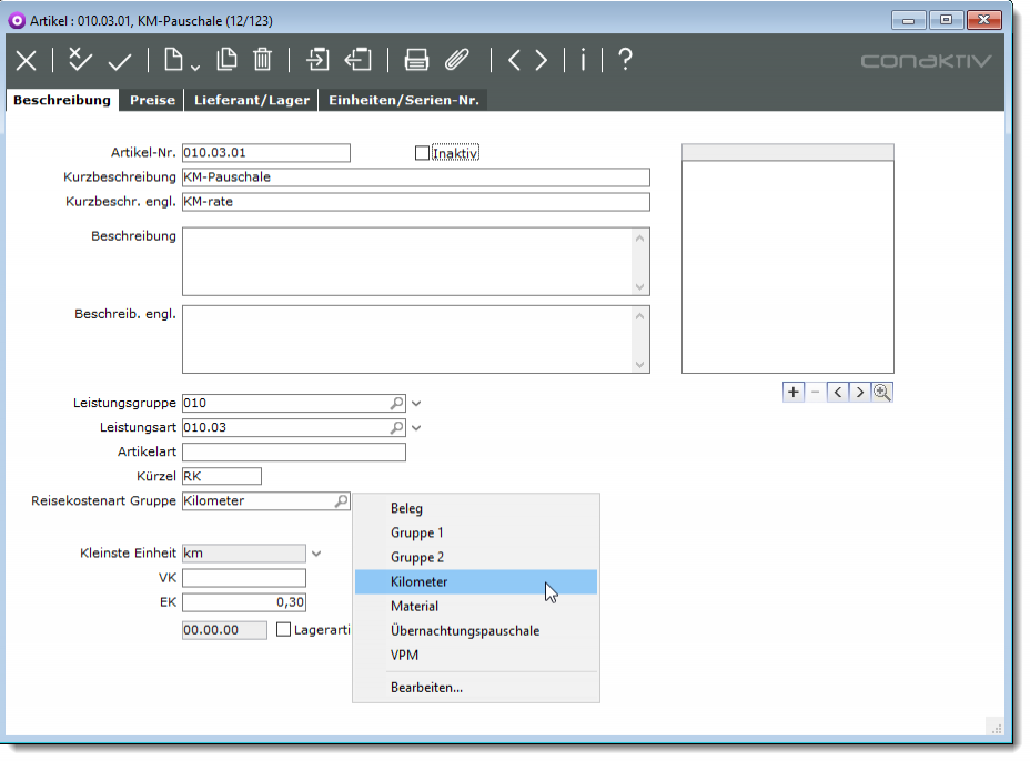 Für die Verwaltung der Reisekosten in einem Projekt und zur Erfassung in einer Reisekostenabrechnung müssen Sie Reisekostenartikel anlegen. Dies erledigen Sie im Modul „Artikel“. Dort erfassen Sie die Artikel, wie z.B. Verpflegungspauschale, Kilometerpauschale, Taxi und Bahn, und ordnen diese der entsprechenden Gruppen der Reisekostenart zu.