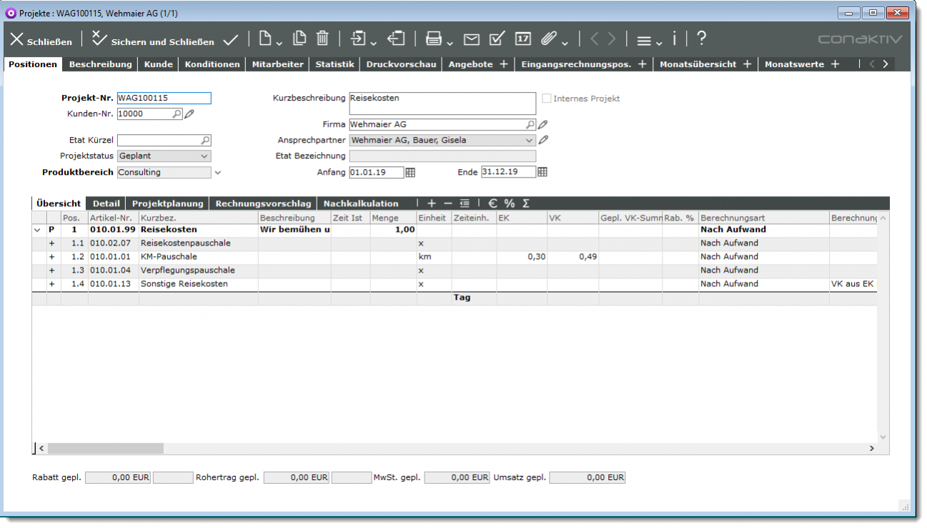 Die Artikel, die Sie zur Reisekostenabrechnung nutzen werden, können Sie mit Hilfe einer Stückliste zu einem Paket zusammenfassen. Das Paket können Sie dann komplett in Ihre Projekte einfügen, sodass jegliche Reisekosten bebucht und abgerechnet werden können.