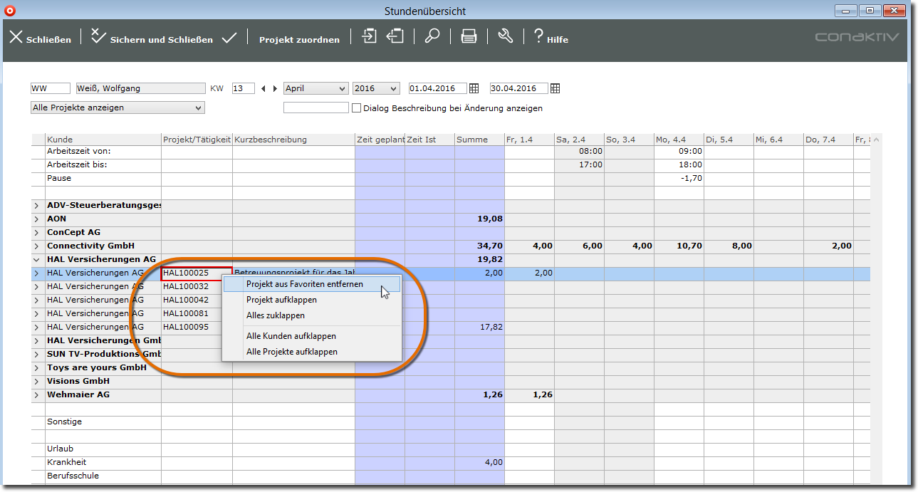Um ein Projekt den Favoriten zuzuordnen, markieren Sie in der Stundenübersicht eine Zeile zu dem Projekt (entweder die Kopfzeile des Projektes oder eine der Positionszeilen), klicken Sie mit der rechten Maustaste auf die Zeile und wählen Sie aus dem sich öffnenden Kontextmenü den Punkt „Projekt zu Favoriten zuordnen“ aus.