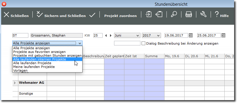 In diesem PopUp-Menü finden Sie alle gespeicherten Suchen, die Ihnen für das Modul „Projekte“ zur Verfügung stehen. Diese Suchen werden auf alle laufenden Projekte angewendet, denen Sie zugeordnet sind. Die gefundenen Projekte werden im Anzeige- und Erfassungsbereich aufgelistet.