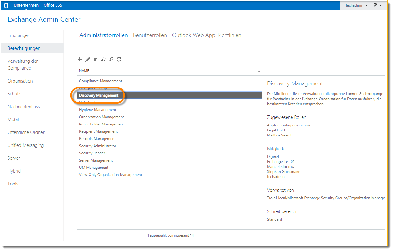 Um den Benutzer der Rollengruppe „Discovery Management“ zuzuordnen, navigieren Sie im Exchange Admin Center unter dem Menüpunkt „Berechtigungen“ zur Rubrik „Administratorrollen“. Doppelklicken Sie dort auf den Eintrag der Verwaltungsgruppenrolle „Discovery Management“.