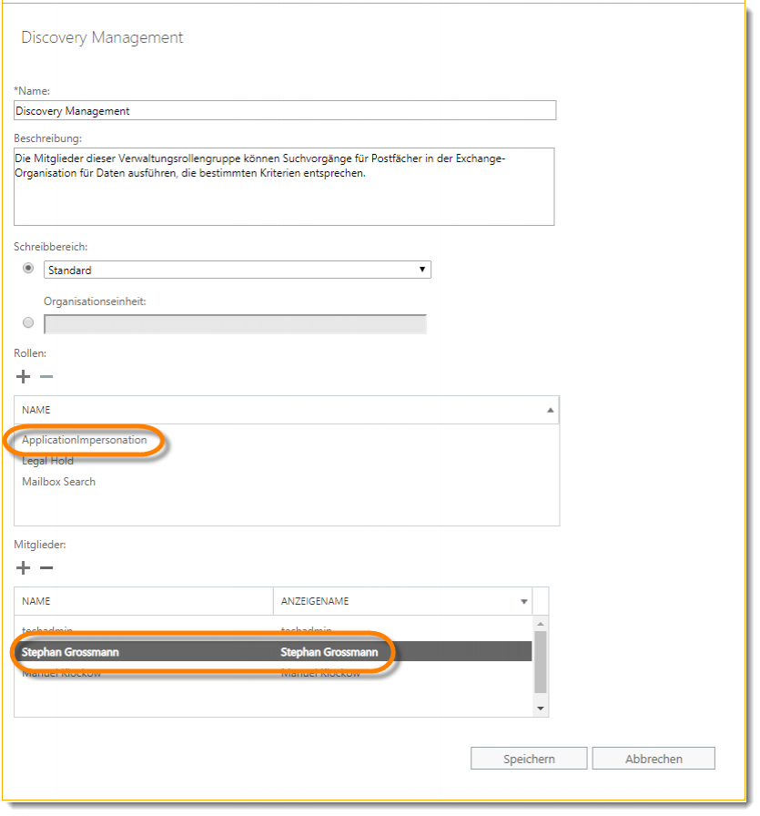 Der Verwaltungsgruppenrolle „Discovery Management“ ist u.a. bereits die Rolle „ApplicationImpersonation“ zugewiesen.