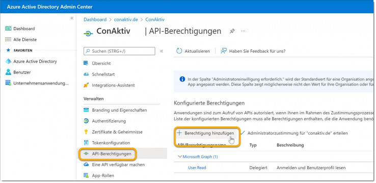 Klicken Sie unter „Verwalten“ auf „API-Berechtigungen“ und dort auf die Schaltfläche „Berechtigung hinzufügen“.
