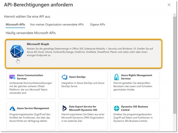 Klicken Sie im sich öffnenden Fenster „API-Berechtigungen anfordern“ auf die Schaltfläche „Microsoft Graph“.