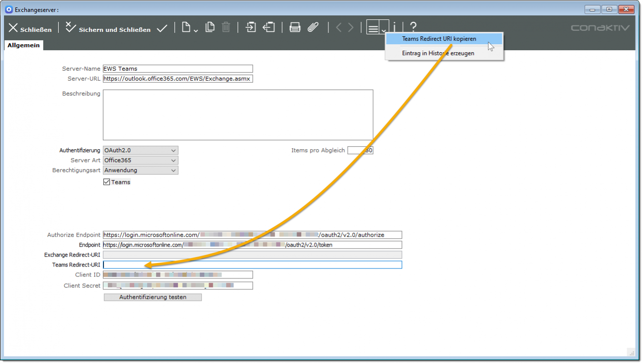 Des Weiteren benötigen Sie den Teams Redirect URI (Uniform Resource Identifier), welchen Sie aus dem ≡-Menü der Toolbar kopieren können und in das entsprechende Feld der EWS-Servereinstellung einfügen.