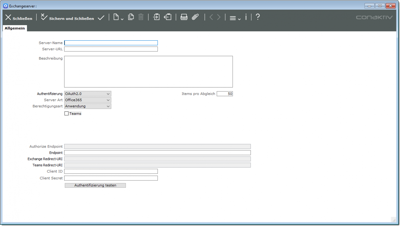 In den Systemparametern von ConAktiv® hinterlegen Sie die Details des Exchange Web Services und der Authentifizierung.