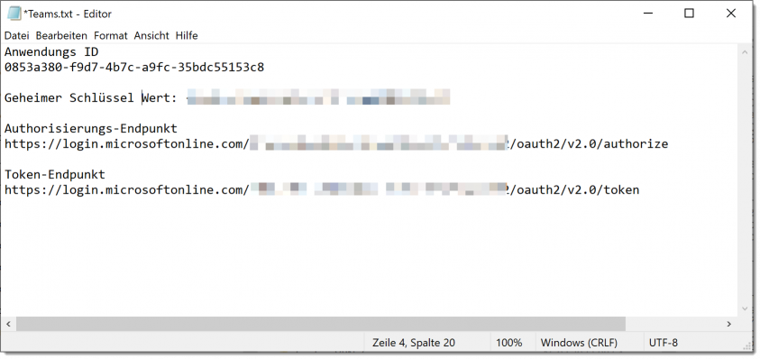 Kopieren Sie die Endpunkte, die Client-ID und das Client-Secret aus der bei der OAuth 2.0 Einrichtung angelegten Textdatei heraus und fügen Sie diese Informationen in die entsprechenden Felder ein.
