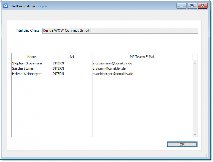 Möchten Sie sehen, welche Kontakte einem Chat zugeordnet sind, so klicken Sie in der Toolbar des in der Eingabemaske geöffneten Datensatzes auf das Menü neben der Teams-Chat-Schaltfläche. Im Menü finden Sie einen Eintrag mit dem Namen des Chats und darunter den Menüpunkt „Chatkontakte anzeigen“. Es öffnet sich ein Fenster mit einer Liste der zugeordneten Kontakte.