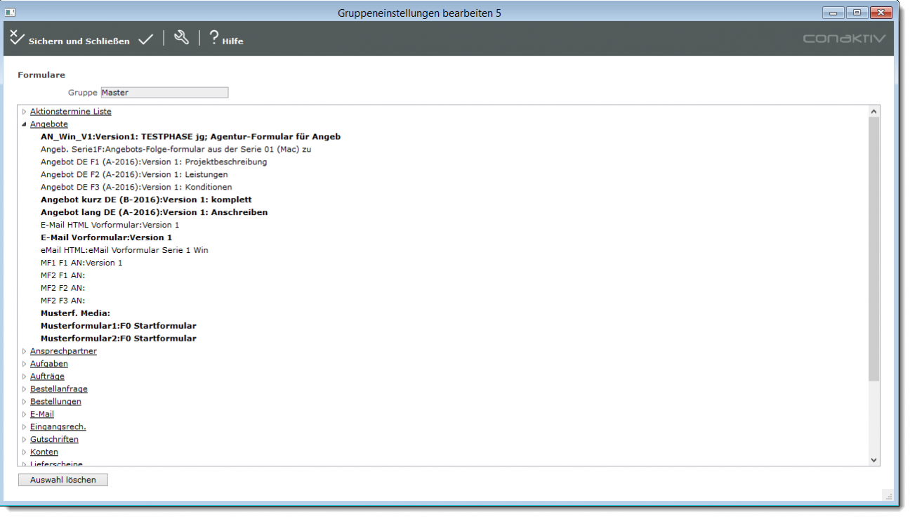 Gelangen Sie auf die Seite der Formular-Einstellungen, so sehen Sie eine Liste der ConAktiv®-Module, für die im Modul „Formulare“ Formulare zur Verfügung stehen. Neben den Modulnamen sehen Sie ein Pluszeichen. Durch Klicken auf dieses Pluszeichen wird die Liste erweitert und es wird eine Liste mit allen für das Modul angelegten Formularen angezeigt.