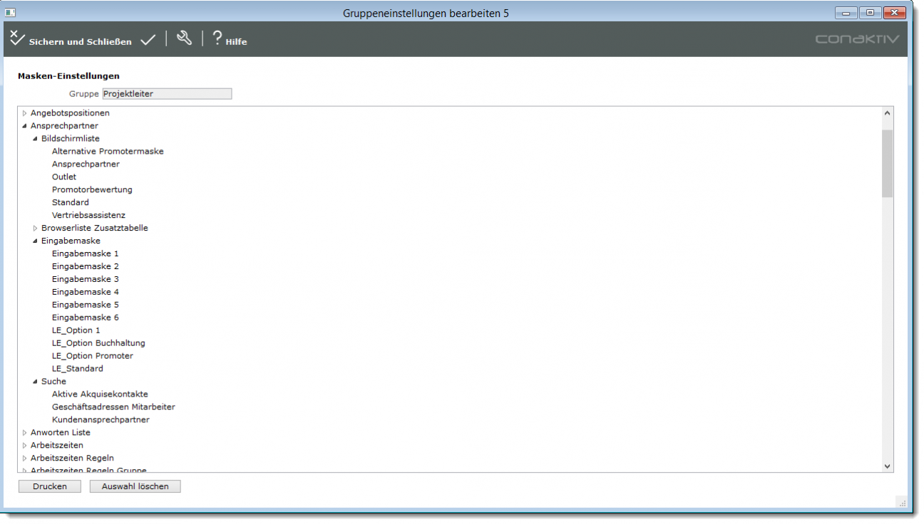 Die Arbeitsoberfläche von ConAktiv® kann stark benutzerindividuell gestaltet werden. So können beispielsweise speziell (durch die Connectivity GmbH) programmierte und selbsterstellte Eingabemasken, Bildschirmlisten und Suchen Ihren ConAktiv®-Benutzern bzw. Benutzergruppen explizit zugewiesen werden. Sie können beispielsweise festlegen, dass ein Benutzer (oder eine Gruppe) für das Modul „Mitarbeiter“ die Bildschirmliste A und Eingabemaske B verwendet, ein anderer aber die Bildschirmliste C und Eingabemaske D.