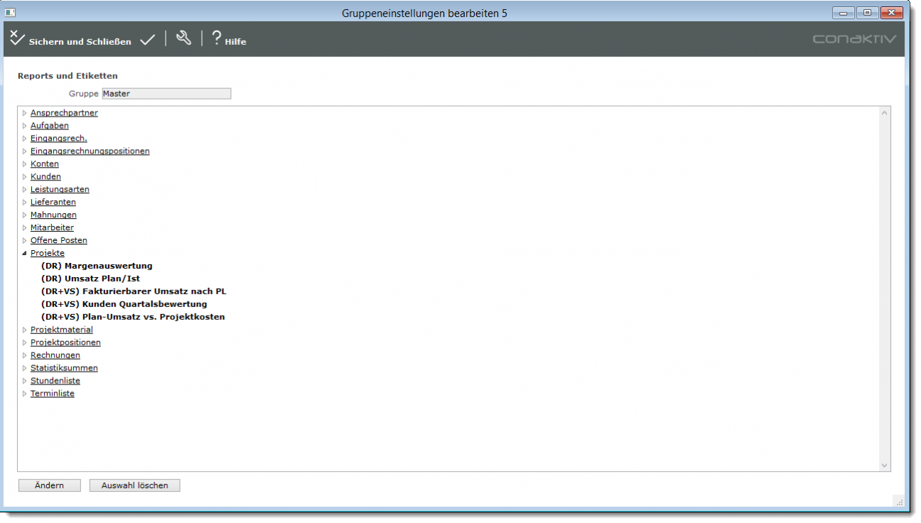 Sämtliche in ConAktiv® erstellten Reports/Etiketten können den Benutzern bzw. Benutzergruppen individuell zugeordnet werden. Erstellen Sie eine Report-/Etikettenvorlage und speichern Sie diese in ConAktiv®, so wird dieser automatisch der Gruppe „Master“ zugewiesen und steht somit jedem Benutzer zur Verfügung.