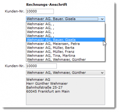 In den Modulen „Projekte“, „Angebote“, „Aufträge“, „Lieferscheine“ und „Rechnungen“ haben Sie die Möglichkeit, mit Hilfe eines PopUp-Menüs einen Ansprechpartner eines Kunden auszuwählen.