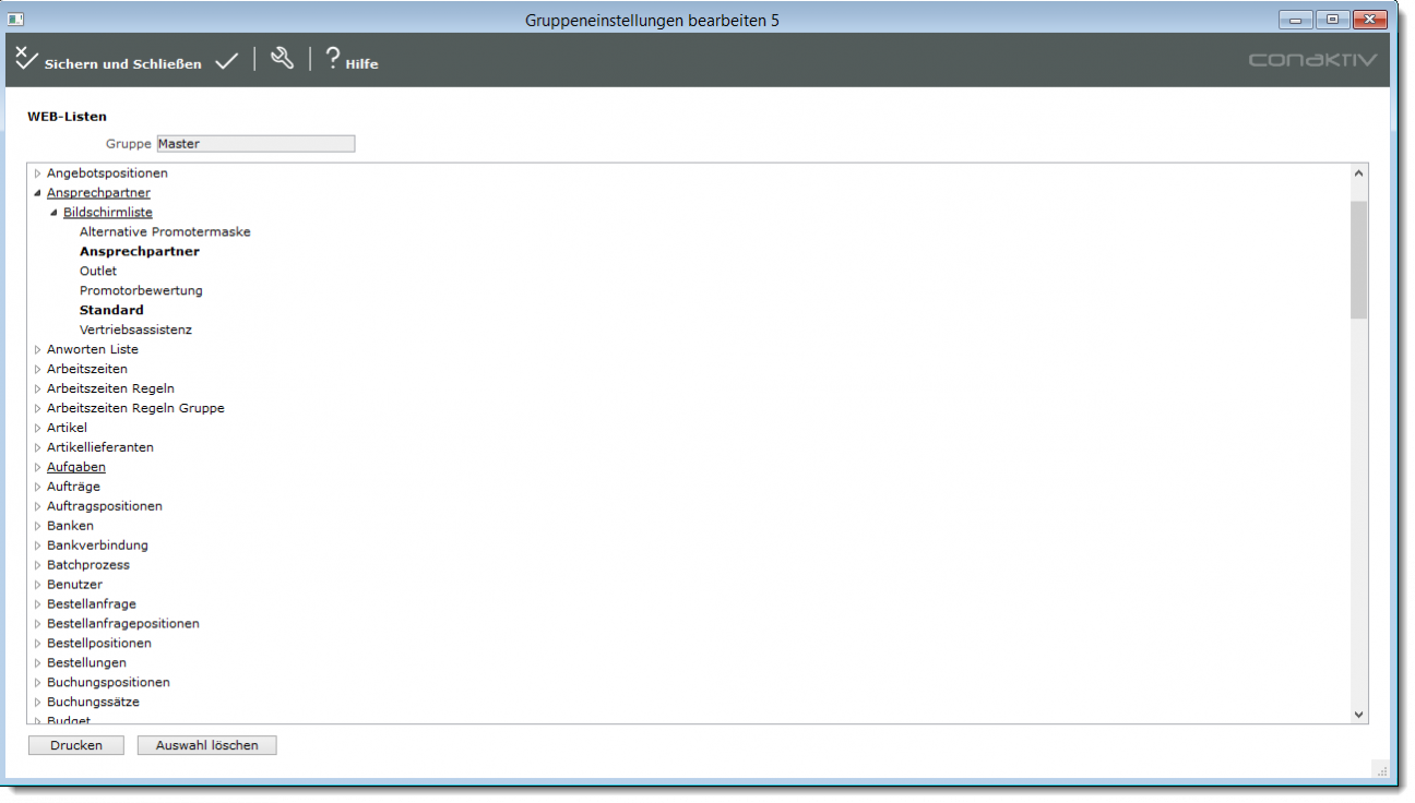Gelangen Sie auf die Seite, auf der Sie die Weblisten einstellen, so sehen Sie eine Liste aller ConAktiv®-Module. Neben den Modulnamen sehen Sie ein Pluszeichen. Durch Klicken auf dieses Pluszeichen wird die Liste erweitert und eine Liste der Listenkategorien (derzeit nur Bildschirmlisten), die für das betreffende Modul zur Verfügung stehen, wird angezeigt.