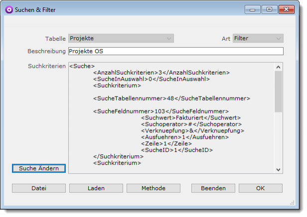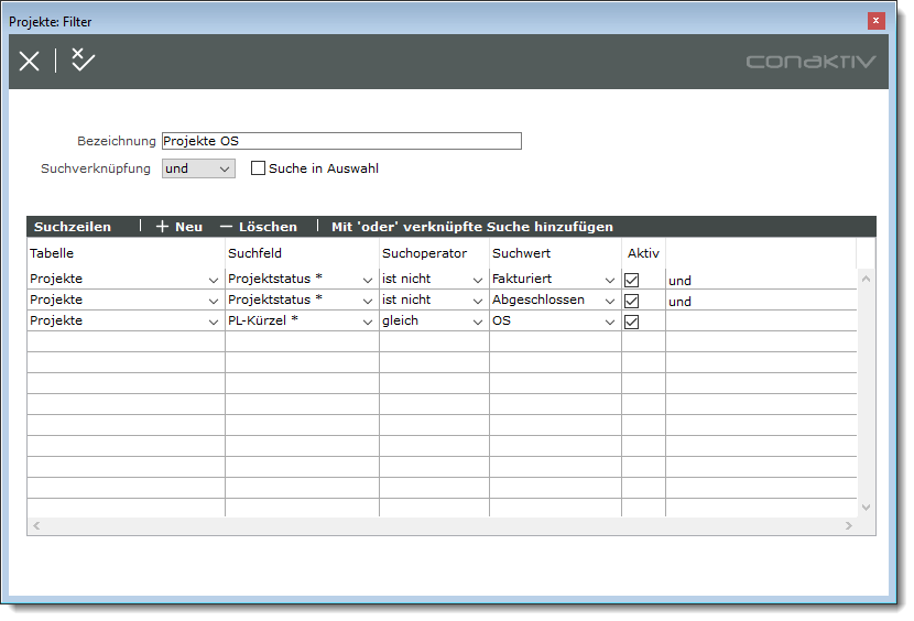 Der Editor wird geschlossen und Sie gelangen auf die Eingabemaske des Filters. Die Filterkriterien werden in einen für ConAktiv® verständlichen Code umgesetzt und im Bereich „Suchkriterien“ angezeigt.