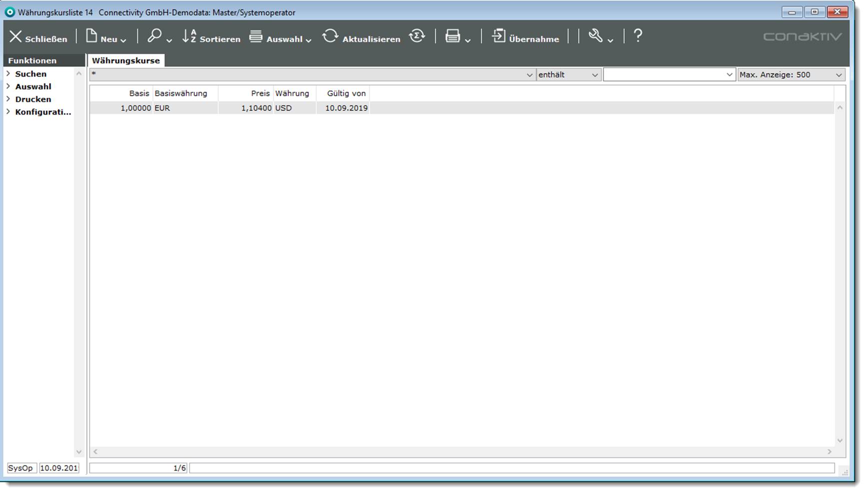 Doppelklicken Sie im Modul „Systemparameter“ den Eintrag „Währungskurse“ oder markieren Sie den Eintrag und betätigen die Return-Taste und lassen sich alle Einträge anzeigen. Der neue Eintrag wird in der Liste angezeigt.
