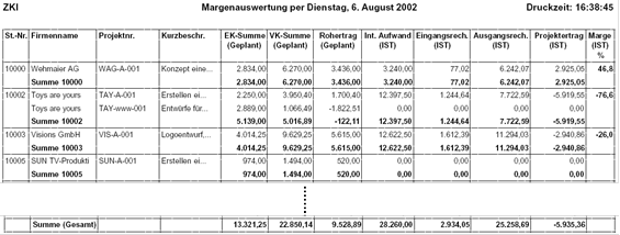 Der Report „Margenauswertung“ stellt für die gesamte Laufzeit des Projektes die im Projekt geplanten Werte den tatsächlich auf das Projekt erfassten Werten (Ausgangsrechnungen, Gutschriften, Eingangsrechnungen, Mitarbeiterstunden, Projektmaterial) gegenüber.