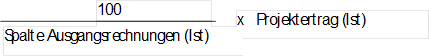 • Spalte „Projektertrag (Ist)“: Der tatsächlich erwirtschaftete Projektertrag. Der Projektertrag errechnet sich wie folgt: