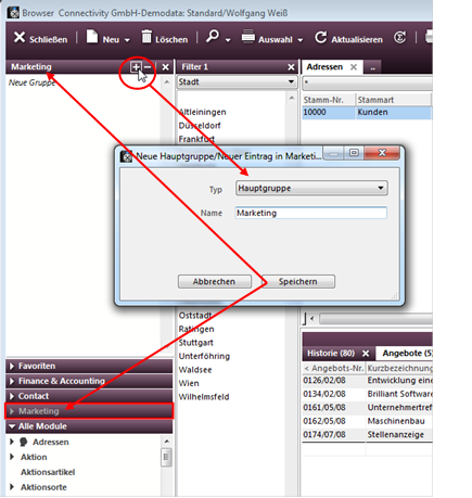 Im Browser können Sie sich eigene Hauptgruppen definieren, mit denen Sie Module, Suchen, Auswertungen, Funktionen und Ansichten, z.B. nach Geschäftsbereichen gruppieren können.