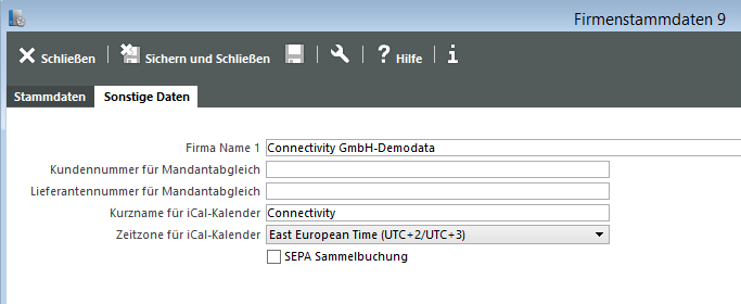 Unter der Registerkarte „Sonstige Daten“ in den Firmenstammdaten der ConAktiv® Systemparameter können zwei Einstellungen zu den CalDAV Kalendern getätigt werden.