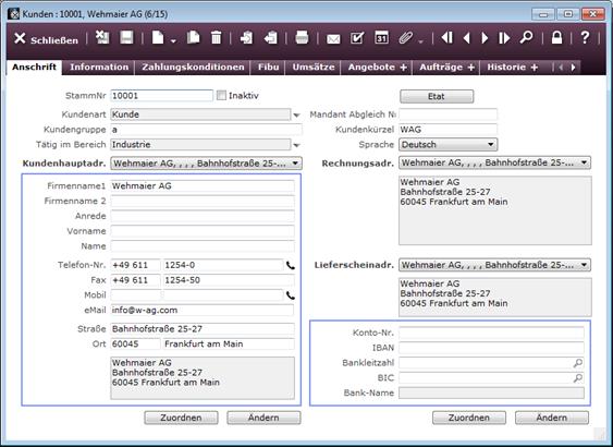 Öffnen Sie einen Datensatz des Moduls „Kunden“, so gelangen Sie auf das Register „Anschrift“. Unter diesem Register ordnen Sie dem Kunden die Hauptadresse sowie die Rechnungs- und Lieferscheinadresse zu.
