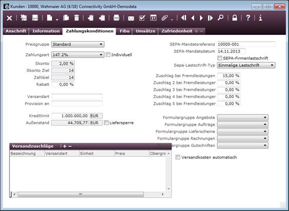 Klicken Sie auf das Register „Zahlungskonditionen“, so gelangen Sie zu dem Teil der Eingabemaske, auf dem Sie u. a. die Zahlungskonditionen und Versandkostenpauschalen für einen Kunden hinterlegen können.