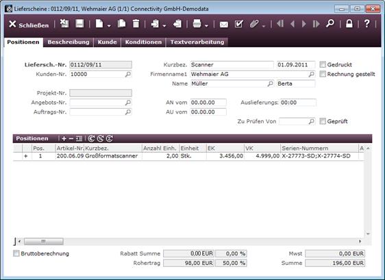 Hierzu erfassen Sie einen Lieferschein an den betreffenden Kunden und erfassen dort den Produktartikel mit allen notwendigen Informationen wie beispielsweise Menge, Verkaufspreis und Seriennummer.