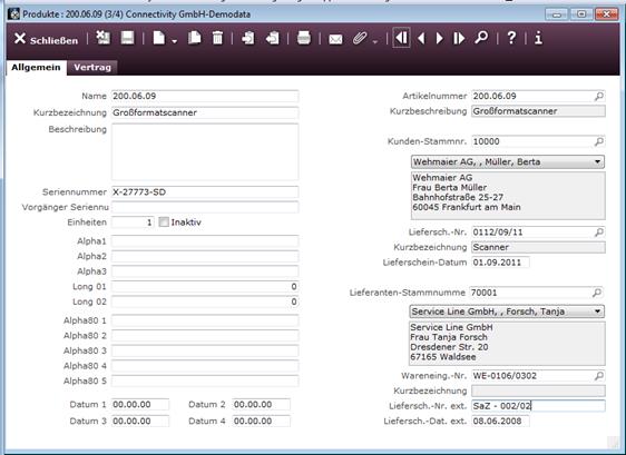 Löschen Sie die Seriennummer in der Lieferscheinposition, mit welcher der Produktdatensatz erzeugt wurde, dann wird der Produktdatensatz mit der betreffenden Seriennummer ebenfalls gelöscht. Wurde dem Produkt ein Vertrag zugeordnet, dann kann die Seriennummer nicht mehr gelöscht werden.