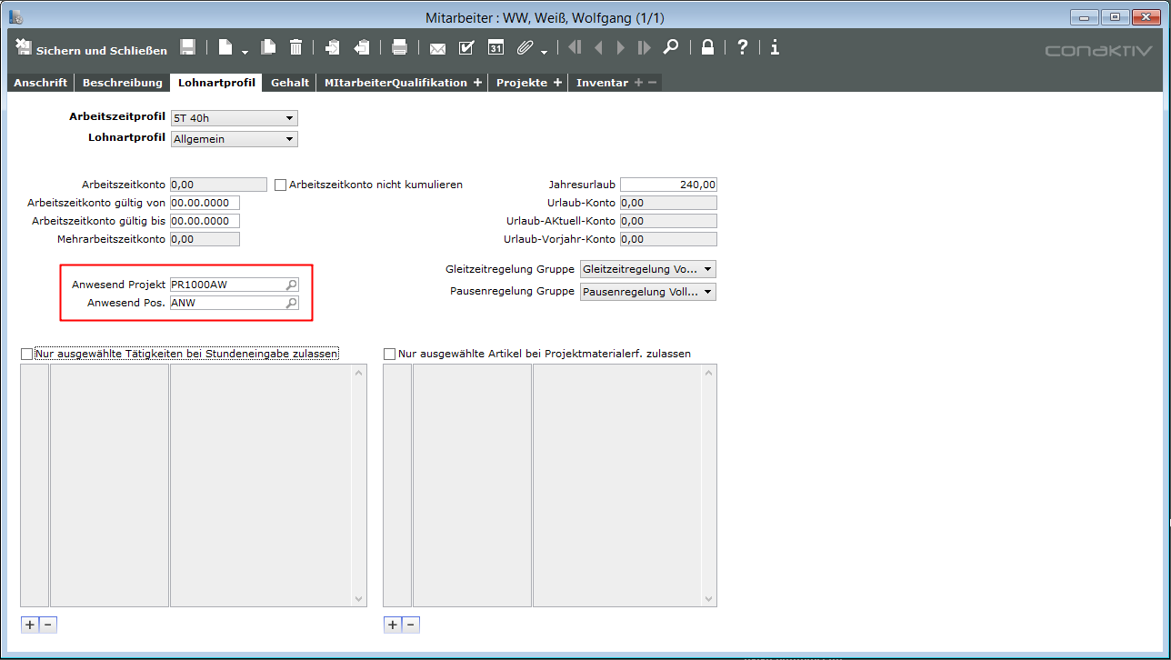 Damit das Anwesenheitsprojekt automatisch mit den Restzeiten der Anwesenheit bebucht wird, müssen Sie dieses mit der dazugehörigen Anwesenheitsposition den Mitarbeitern zuordnen.