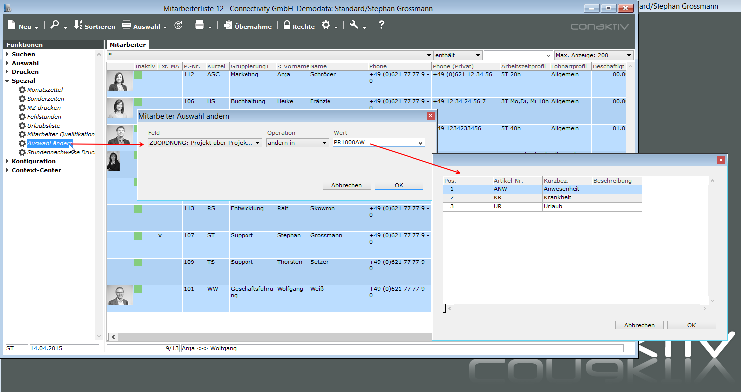 Alternativ können Sie die Zuordnung des Anwesenheitsprojekts und der Anwesenheitsposition auch in der Bildschirmliste des Moduls „Mitarbeiter“ erledigen. Markieren Sie hierzu alle Mitarbeiter, denen das Projekt und die Position zugeordnet werden soll und führen Sie aus dem Spezialmenü der Bedienleiste die Funktion „Auswahl ändern“ aus. In dem sich öffnenden Dialog wählen Sie im PopUp-Menü „Feld“ die Option „ZUORDNUNG: Projekt über Projektnummer“ aus und geben im Feld „Wert“ die Projektnummer des Anwesenheitsprojekts ein. Verlassen Sie das Feld „Wert“, dann öffnet sich ein Auswahlfenster, in welchem Sie die Anwesenheitsposition auswählen können.