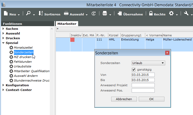 Sonderzeiten sind Zeiten, die nicht als Arbeitszeiten gewertet werden, z.B. Urlaub, Krankheit, Sonderurlaub und unbezahlte Freizeit. Mithilfe der Sonderzeiten können Sie festhalten, wie viele Tage ein Benutzer z.B. Urlaub in Anspruch genommen hat und ihm noch zur Verfügung steht oder wie oft der Mitarbeiter krank war.