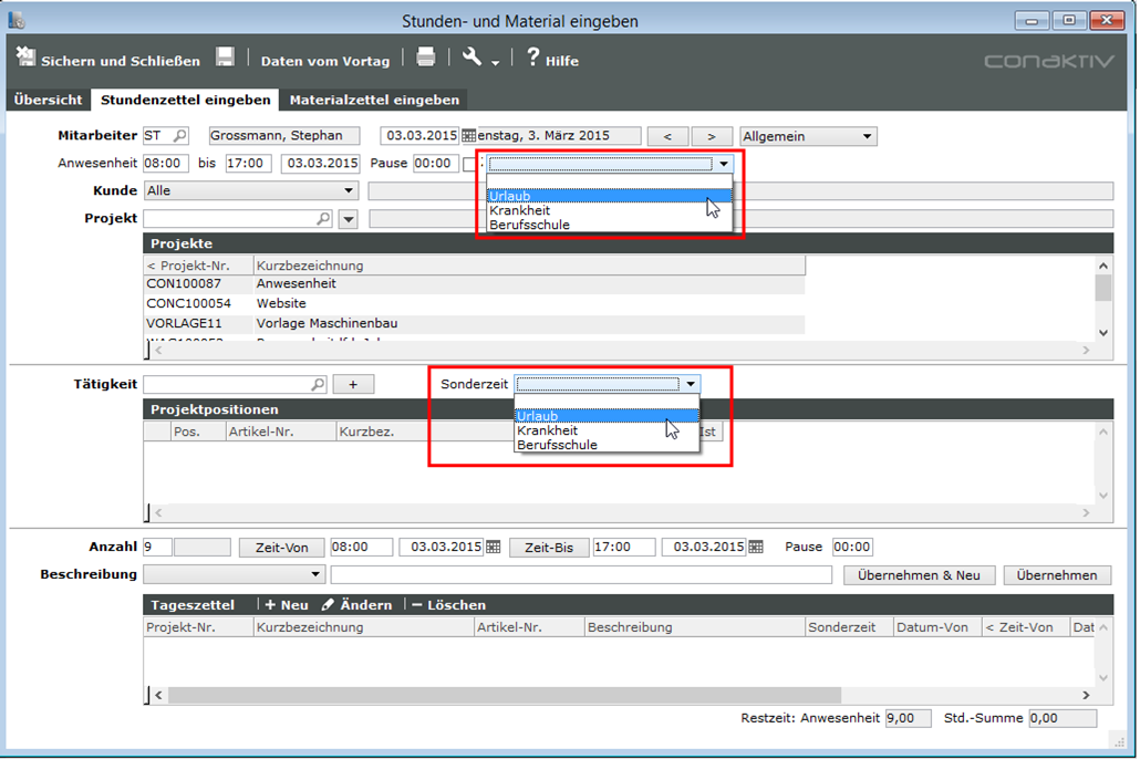 Sonderzeiten können entweder stundenweise oder tagesweise gebucht werden. Die Buchung kann entweder zentral im Modul „Mitarbeiter“ erfolgen (Bildschirmliste, Spezialfunktion „Sonderzeiten“) oder im Modul „Stunden eingeben“. Derzeit werden zehn individuell verwendbare Sonderzeiten mit den dazugehörigen Sonderzeitkonten von ConAktiv® verwaltet.
