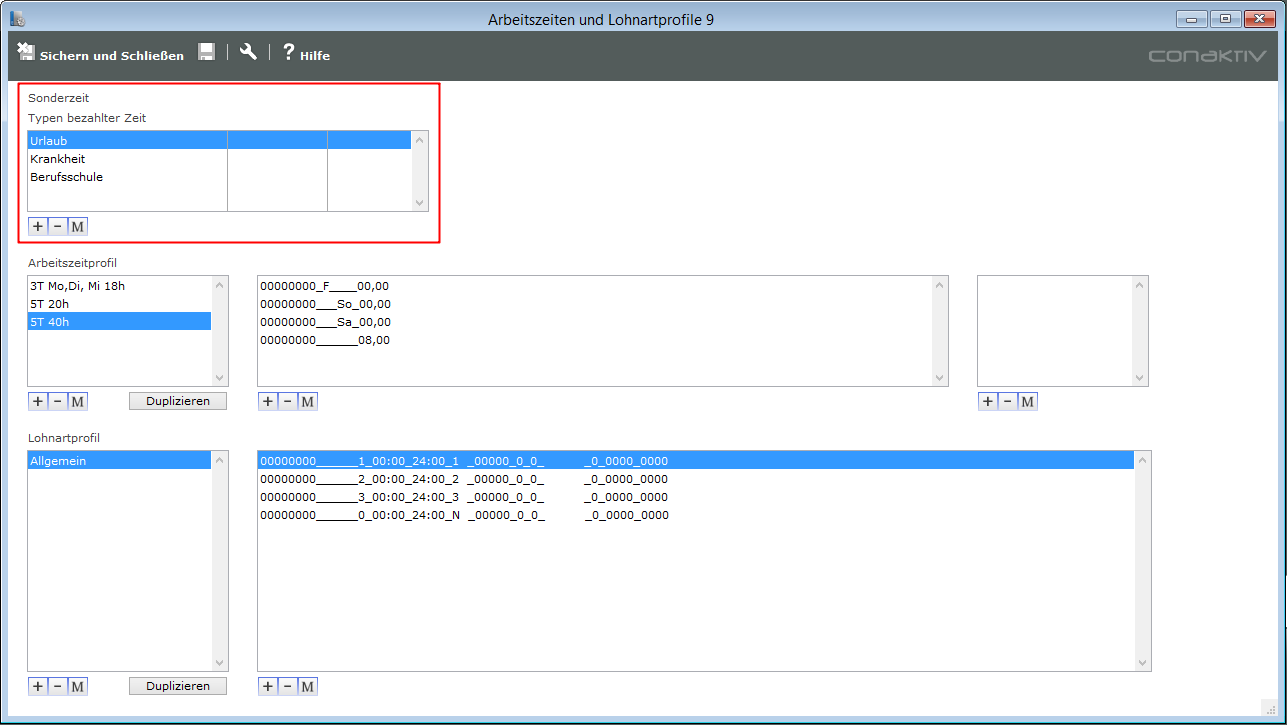 Modul „Systemparameter“, Eingabemaske „Arbeitszeiten und Lohnartprofile“, Bereich „Sonderzeit“