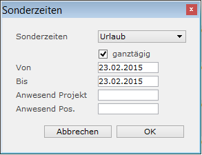 In dem PopUp-Menü „Sonderzeiten“ werden die von Ihnen definierten Sonderzeiten zur Auswahl angeboten. Wählen Sie hier die gewünschte Sonderzeit aus, die Sie dem Mitarbeiter zuordnen möchten.