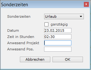 Ist das Ankreuzfeld „ganztägig“ deaktiviert, können Sie die Dauer der Sonderzeiten in den Feldern „Datum“ und „Zeit in Stunden“ angeben. Die Stundenanzahl können Sie entweder als Dezimalzahl eingeben, z.B. 2,5 Stunden oder im Format HH:MM, z.B. 02:30, sofern die allgemeine Einstellung „Standardzeit für die Eingabe ist die Minute" für das Modul „Stunden- und Material eingeben“ aktiviert ist.